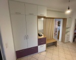 Großer 2-türiger Schrank raumhoch 100 cm breit, oben mit Klappen, unten 2 Auszüge Sideboardschrank 50 cm breit, 2 Schüben und 1 Auszug, Spiegel-Rückwand darüber ein Klappenschrank Sitzbank mit Schuhablage (Edelstahl-Rohre) 90 cm breit, darüber Profil-Rückwand Überbau über eine eventl. vorhandene Türe oder Schiebetüre Hochschrank raumhoch 60 cm breit, 3 Schubläden, offene Fächer, 1 Türe, darüber 1 Klappe