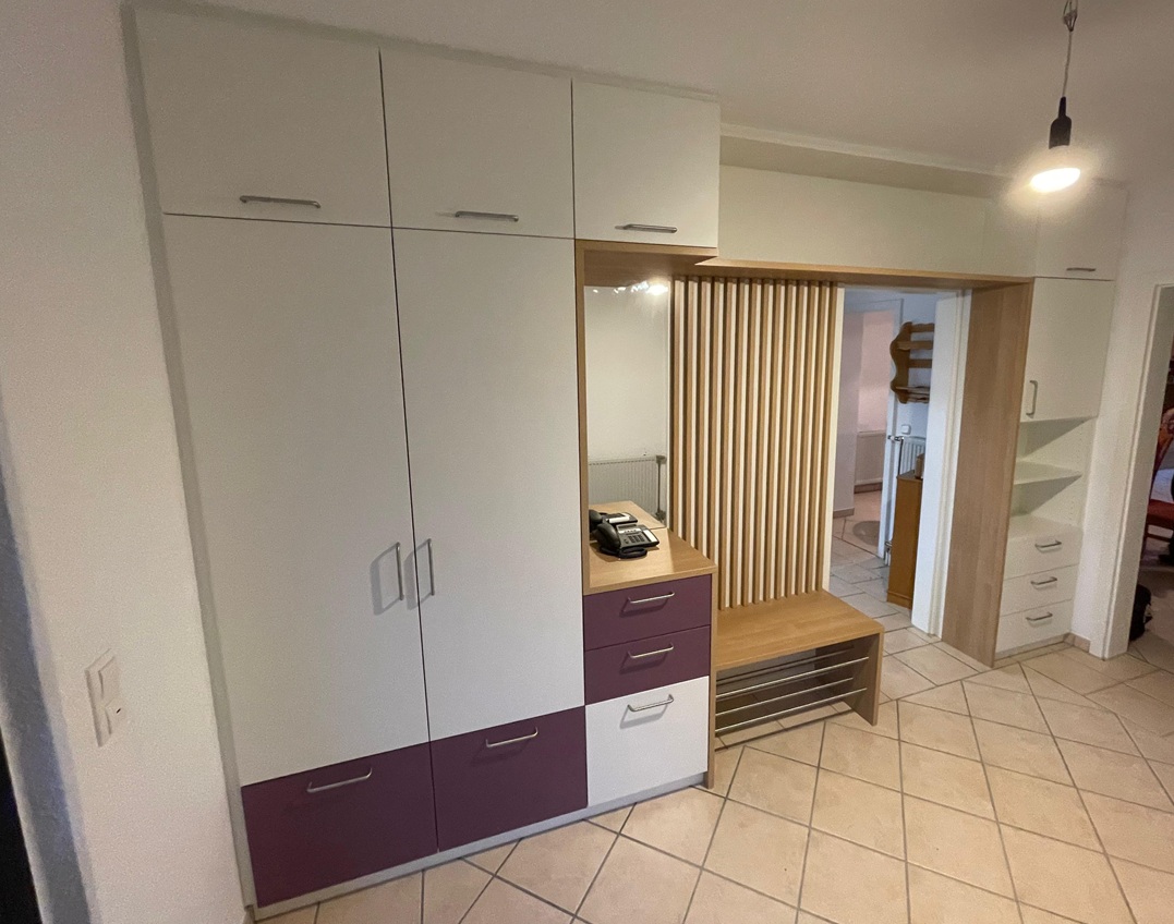Garderobe, Ausführung Kunststoff-Dekor weiß Absetzungen in Eiche-Dekor, Front-Absetzung "brombeer" komplett wie Abbildung, Gesamtmaß: 390 cm breit x 245 cm hoch